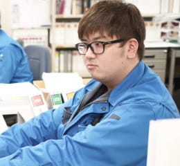 - 営業は、自社の製品情報はもちろん、それらがどのようにできているかも含めて、すべてを把握しておかなければ、先方と話ができません。そのため、入社後は1年間の研修で、組み立てから設計、検査まですべての部署を一通り経験。2年目に入ってようやく先輩と一緒に取引先を回るようになり、現在はその中で対応の仕方や現場の空気感などを学んでいるところです。また、電気についての知識も1年で修得できるものではありませんから、引き続き各分野の先輩方に知識や技術を教えてもらっています。